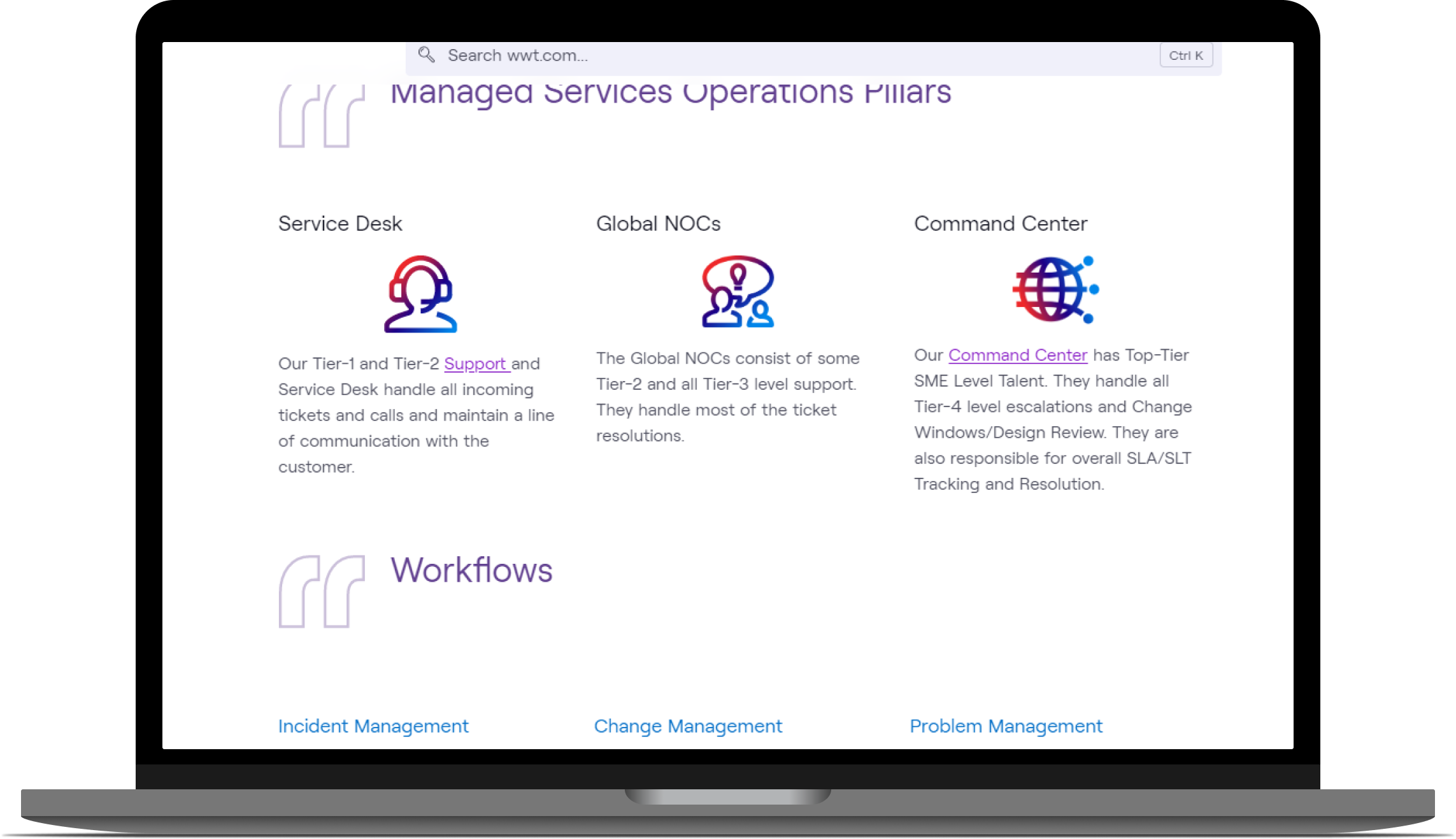 The Managed Services team within World Wide Technology sells technology packs to clients to solve their technology problems. Employees visit an internal website to learn more about the services WWT’s Managed Services team offers. My role was to redesign an internal website that presents information to drive sales.